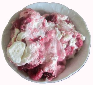 Zuerst Schaumgebäck -- dann Sahne-Quarkgemisch -- gefrorene Himbeeren -- dann wieder