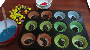 Regenbogenmuffins - bzw Papageienmuffins: Zubereitung: Die Regenbogenmuffins, bzw Papageienmuffins:Die Butter in einem Topf erwärmen und schmelzen lassen. Die Buttermischung in das Mehl rühren und einen glatten Teig herstellen. Ca 120 Gramm vom Teig abnehmen und in einer extra Schüssel mit 3 Teelöffel Kakaopulver verrühren. Ein Muffinbrett mit bunten Muffinpapieren auslegen.Je einen Teelöffel vom braunen Teig in die Förmchen geben, bis der braune Teig verteilt ist. Die Schüssel ausspülen, wieder 120 Gramm Teig abnehmen und mit der Lebenmittelfarbe blau färben.