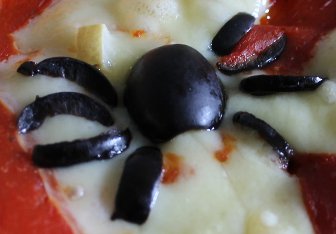 ich mache eine runde Pizza draus ... Dafür einfach den Boden samt Backpapier über eine runde Form legen (ca 30 cm), etwas hineindrücken und dann mit einer Schere den Überstand abschneiden. An den Rändern nun fehlende Stellen mit dem "Abschnitt" füllen, etwas mit dem restlichen Boden verkneten, fertig ist der Pizzaboden. Ofen auf 200° vorheizen. Die Tomatensoße auf dem Boden verteilen, evtl. etwas nachwürzen.Den Käse in lange, dünne Streifen schneiden und nun am äußersten Rand den Spinnenweb-Rahmen legen. Von den Winkeln nun Streifen in die Mitte legen, passend schneiden. Die entstandenen V nun unregelmäßig mit weiteren Käsestreifen füllen und die Pizza nun in den Ofen schieben. Bei den Käsestreifen darauf achten, dass sie nicht zu dick sind und nicht zu eng gelegt, sonst hat man auf der fertigen Pizza eine gleichmäßige Käseoberfläche :) Während die Pizza im Ofen ist, 2 entkernte, schwarze Oliven zur Spinne verarbeiten.