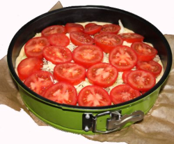 Außerdem habe ich die Hälfte der Eier-Käse-Sahne schon auf dem Kuchen verteilt, bevor ich die Tomaten aufgelegt habe.