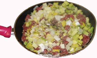 kleingeschnittenen Porree anbraten, bis das Hackfleisch krümelig ist. Mit Kräutersalz salzen, die Dose Tomatenstückchen (nicht abtropfen lassen) unterrühren.